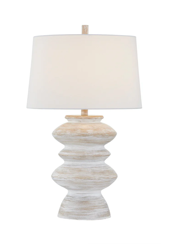 Designed to captivate, this table lamp features a striking ridged silhouette finished in a rustic distressed wash, adding texture and artistic appeal. Its well-balanced form seamlessly complements both transitional and modern interiors. The whitewashed base is beautifully paired with a crisp white linen tapered drum shade, complete with a matching harp and finial, creating a refined statement piece.