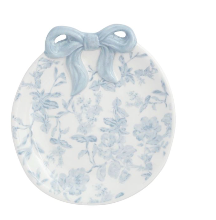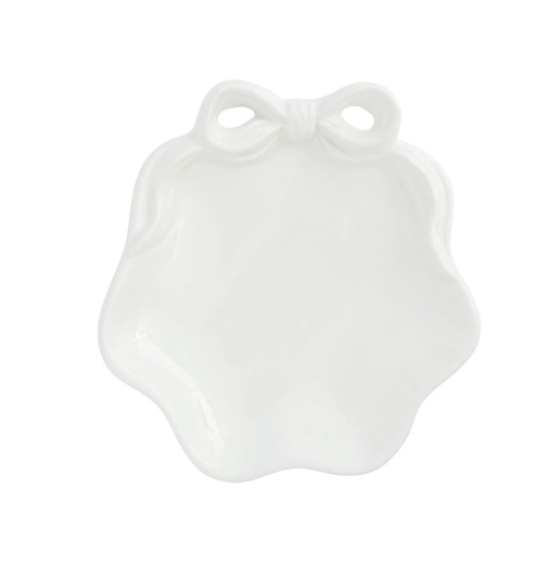 Ceramic ring dish features hand-painted, dimensional ceramic bow and ribbon detail around rim.