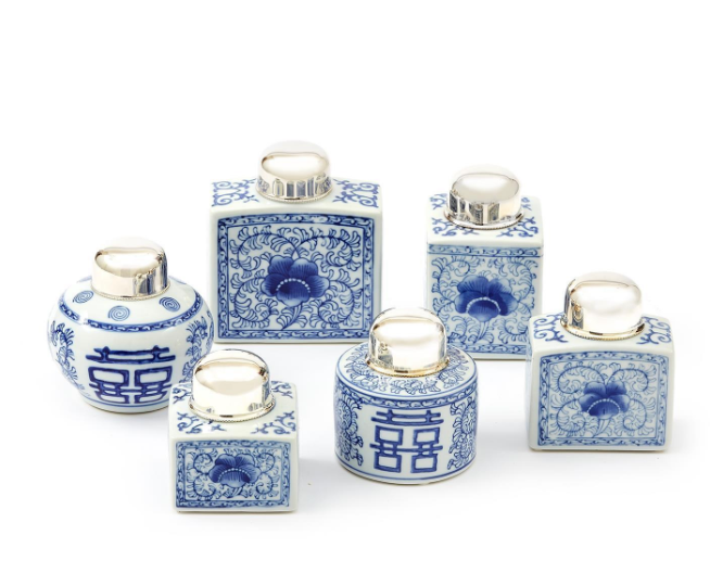 These blue and white tea jars are hand painted with traditional Chinese patterns. Each jar comes with a silver plated brass top.