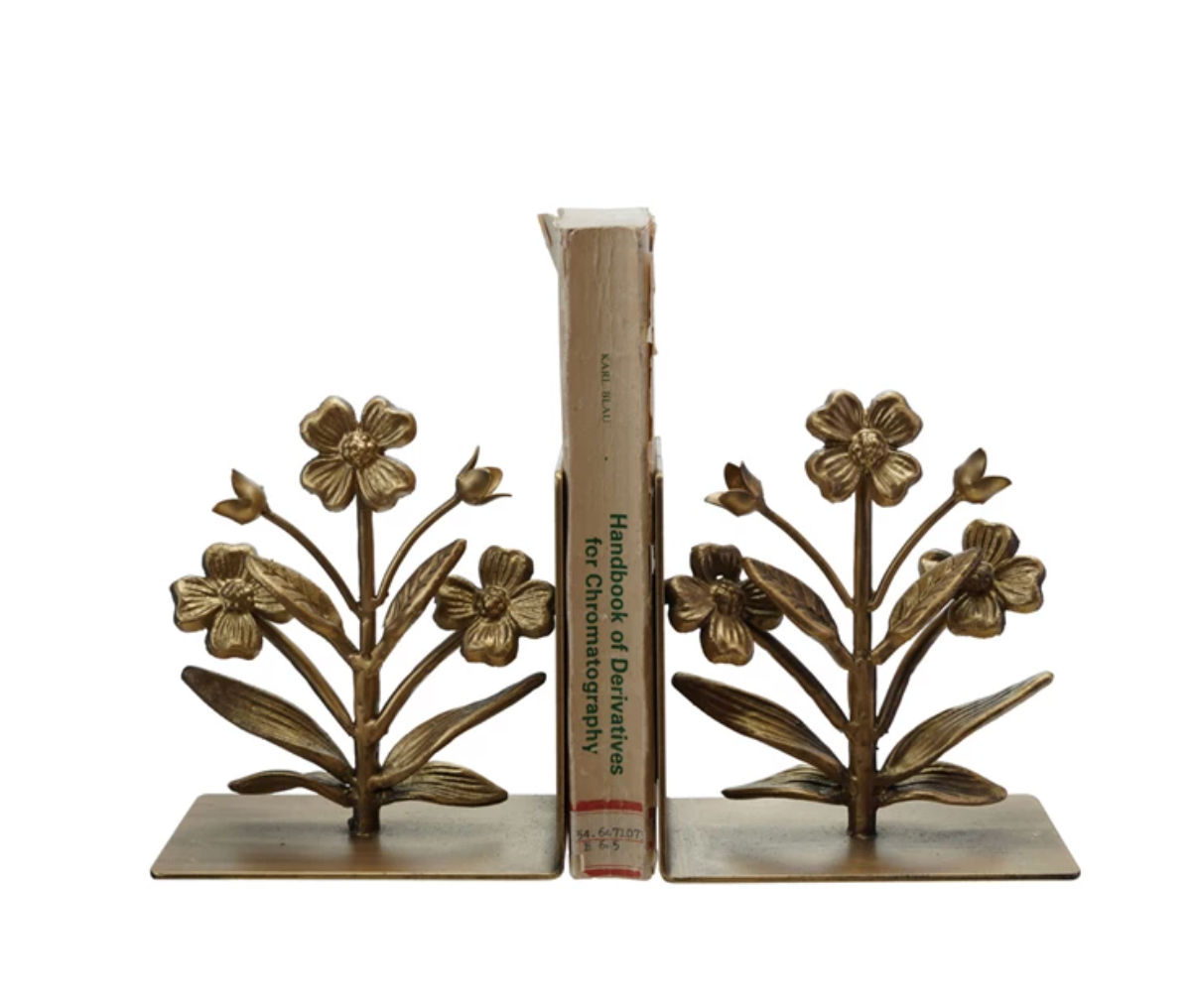 5-1/2"L x 3"W x 6-1/2"H Cast Iron Flower Shaped Bookends, Gold Finish, Set of 2