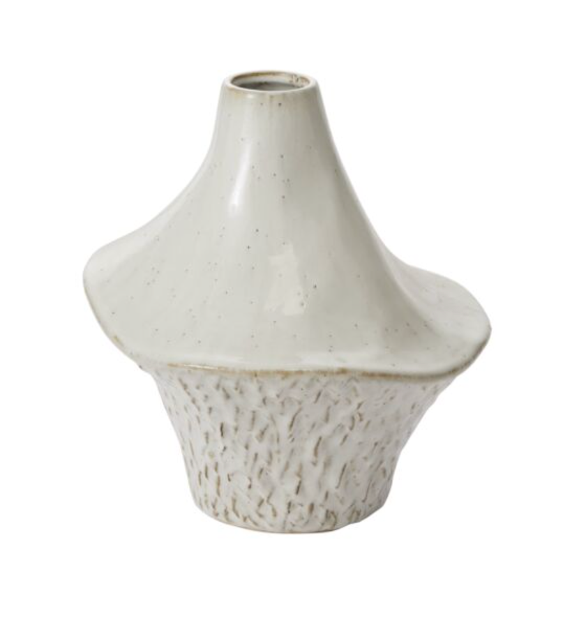 Bring unique sculptural art & versatile functionality to home decor with the Cornett Vase. This ceramic asymmetrical vase features a white semi-gloss glaze with warm undertones, tapered base, & an exaggerated wide middle. The bottom half has carved lines, while the top surface is a smooth but organic texture. A narrow opening is perfect for fresh or dried statement stems, or this vessel makes a statement on its own on a console or styled shelves.