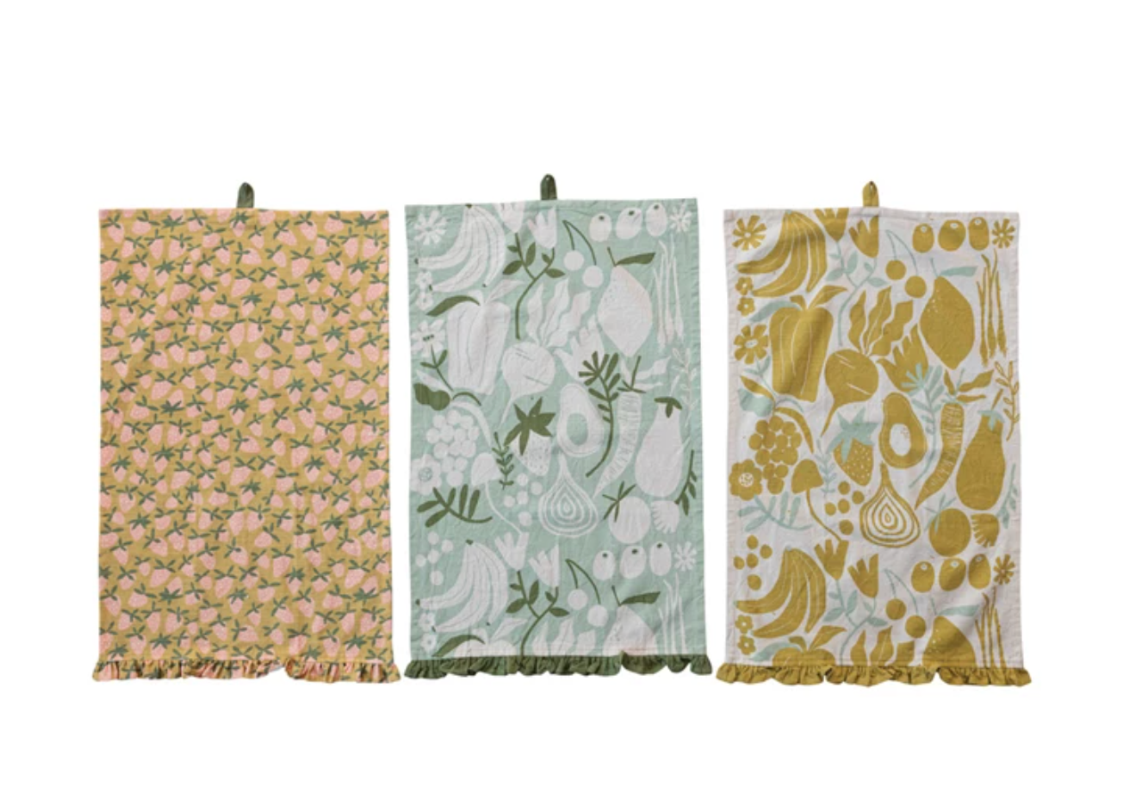 COTTON PRINTED TEA TOWEL WITH FRUIT VEGETABLES RUFFLE & LOOP
