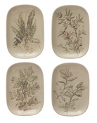 This elegant set of dishes showcases a delicate debossed botanical design in a naturally variating reactive glaze.