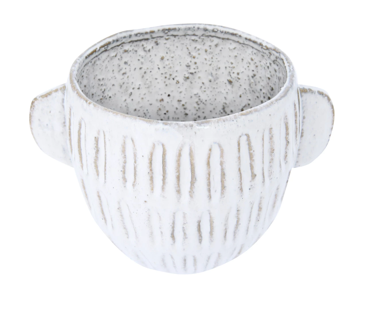 With ear-style handles, this off-white stoneware planter features a remarkable reactive glaze finish. The glazing process creates individual works of art on each distinctive piece. Fill it with a potted plant and display on a tabletop or mantel for an amazing accent to the room decor.