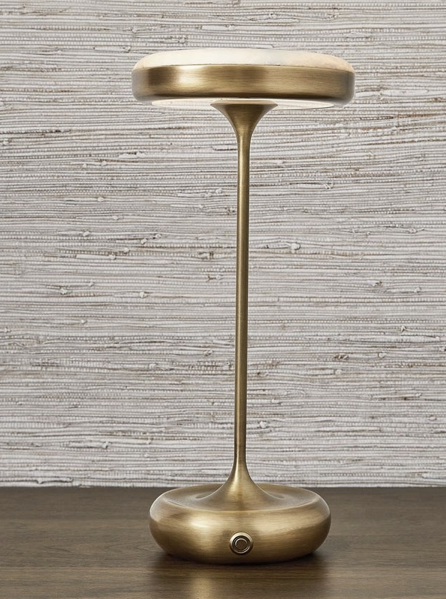 The Flat Top mini lamp is illuminated top and bottom. The top showcases rich white alabaster framed in light antique brass finished steel. It has a dimpled base and a dimmer switch. This rechargeable lamp is great as a night light or perfect anywhere a power outlet is not accessible. The rechargeable USB base can even recharge the batteries and your phone.