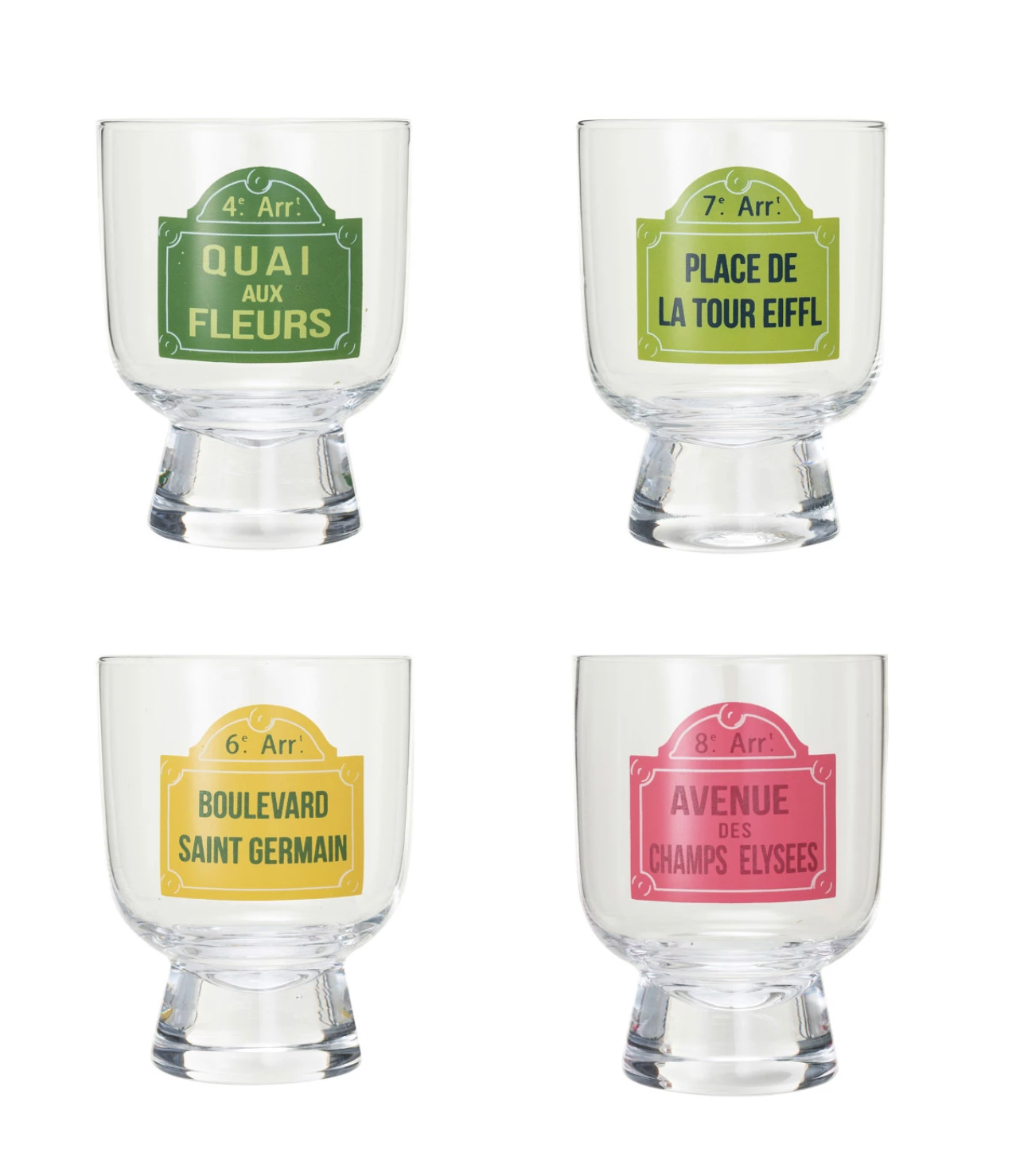 Round x 3-3/4"H 6 oz. Footed Drinking Glass w/ Paris Street Sign Design, Multi Color, 4 Styles