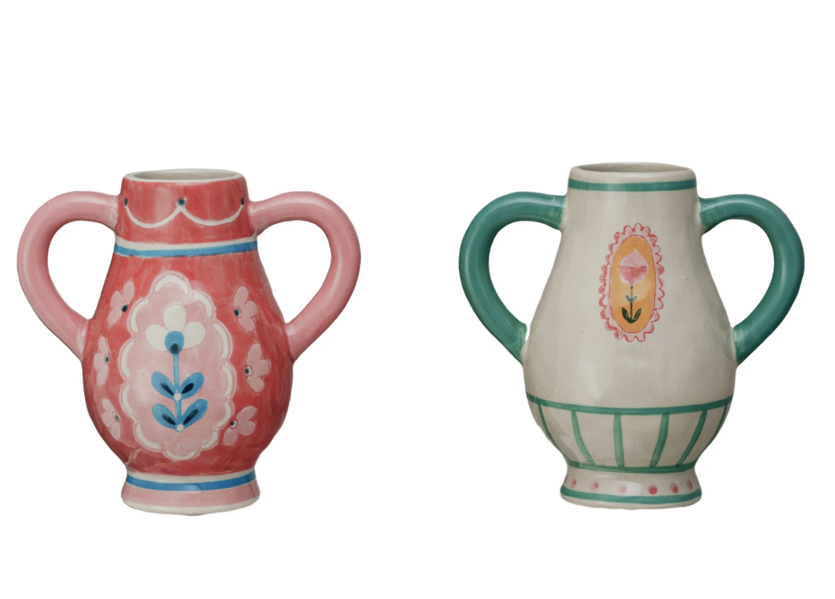 6"L x 3-3/4"W x 6"H Hand-Painted Stoneware Vase w/ Flower Image & Handles, Multi Color, 2 Styles