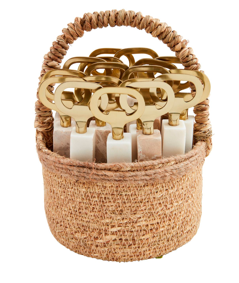 Brass finished metal bottle opener with marble or marble and resin handle.