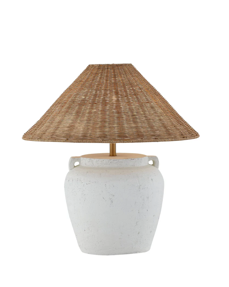 Blending contemporary style with organic elements, this table lamp features a ceramic base with hand-applied detailing that creates a stone-like texture and an elegant urn silhouette. The natural rattan empire shade adds warmth and dimension, enhancing its artisanal appeal. Whether styled solo on a console or side table or placed in pairs on nightstands, this lamp brings an organic touch.