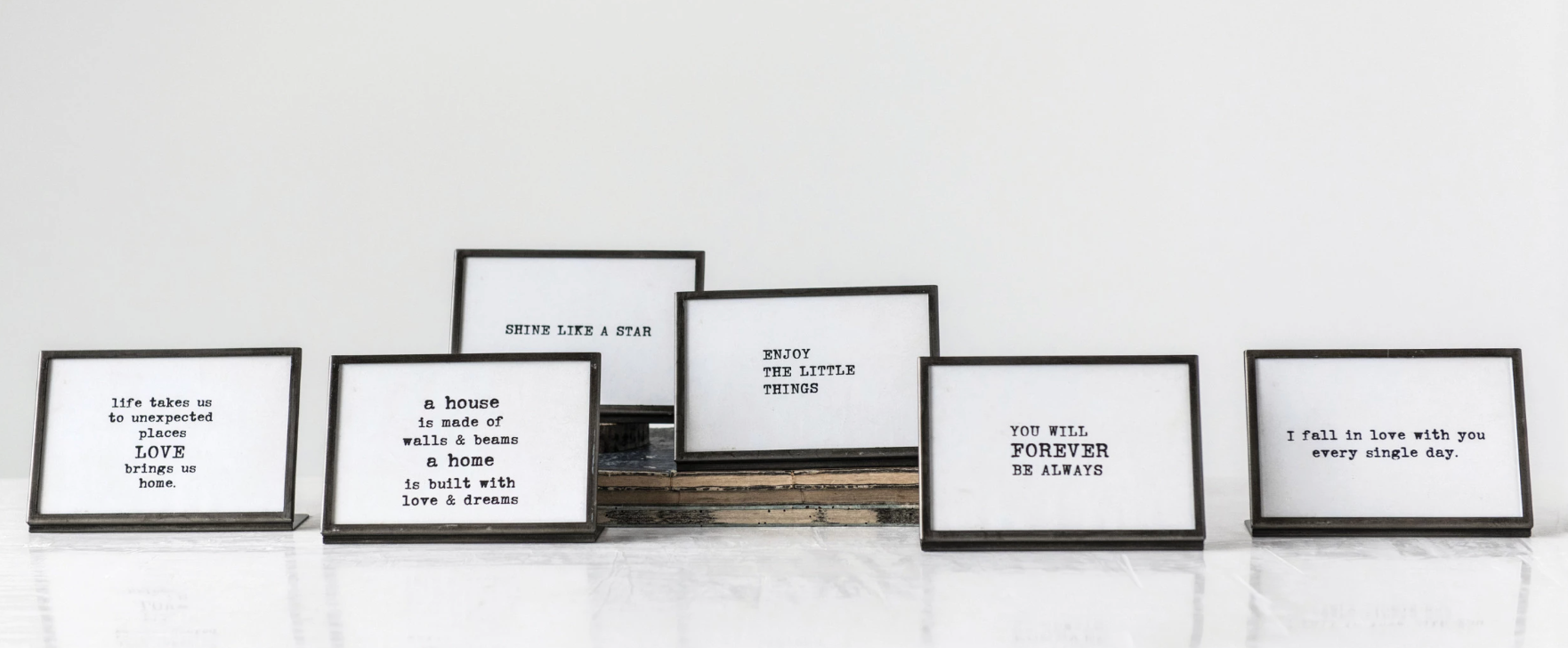 Six metal frames each hold a different phrase to be enjoyed. If desired, the phrases can be replaced with precious photos of family and friends. To create a unique setting, keep the three favorite phrases and place photos in the other three. Mix them together on a tabletop for an enjoyable combination of media.