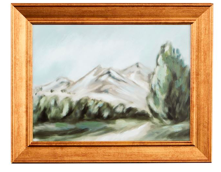 Framed canvas mountain scene print. Sawtooth hanging hardware.