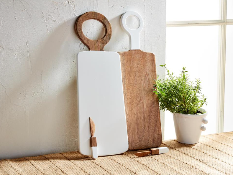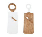 2-piece set. Mango wood ring paddle board with high gloss lacquer detail. Comes with coordinating spreader.