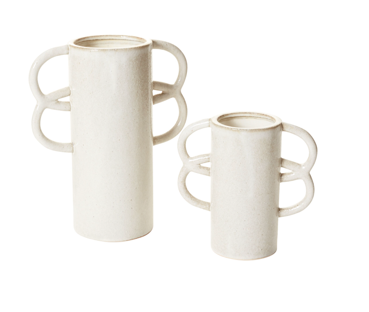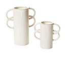 Earthy with a handmade sensibility, an overlapping double handle design & reactive glazed finish, the white, textured ceramic Ohanna Vase is a stunning, sculptural vessel & decorative piece for a bookshelf or tabletop display. Pair next to additional Ohanna sizes for a coordinated arrangement, with or without florals.