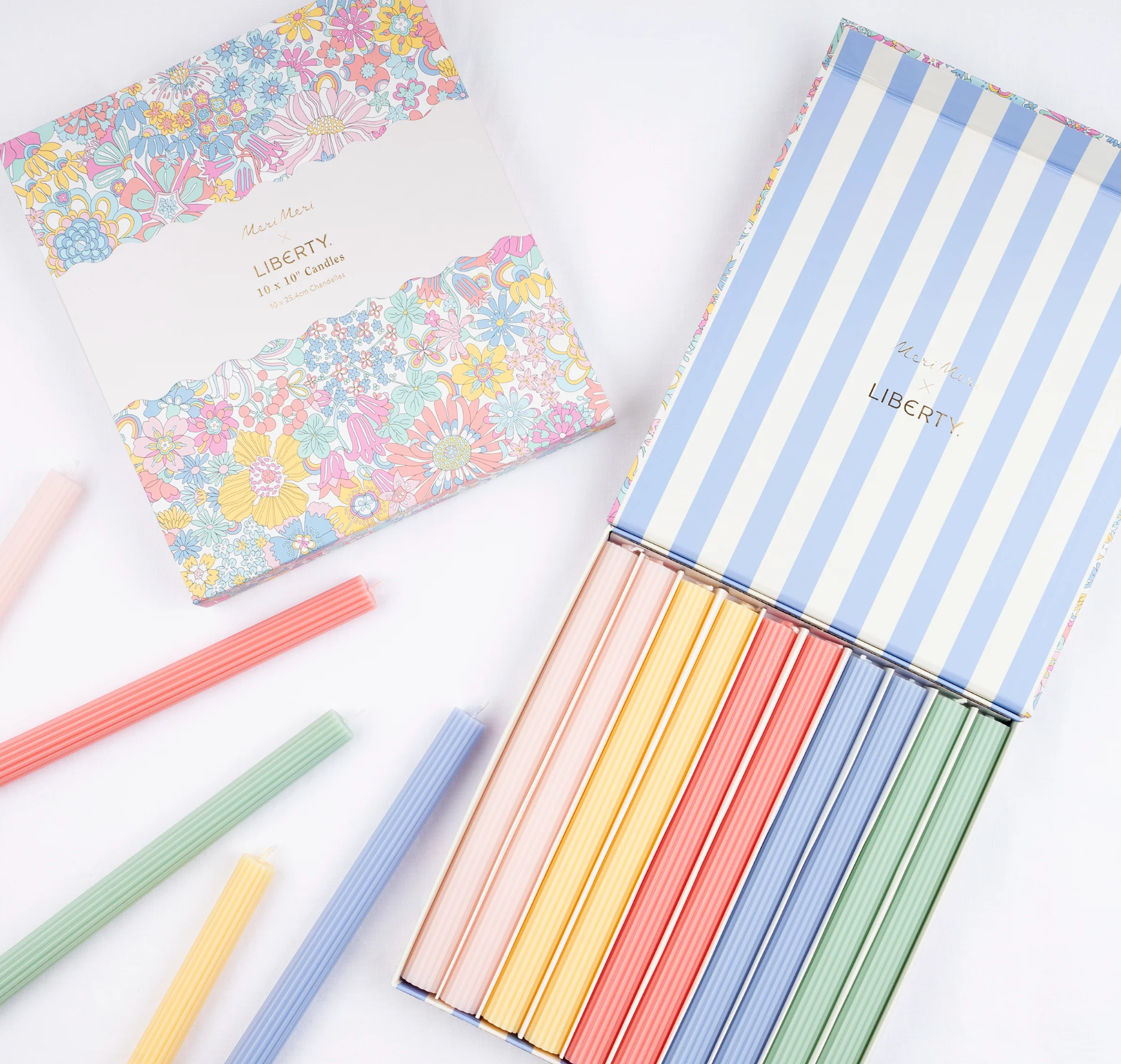 Ten ridged candles, in five colors, are packaged in a gift box adorned with a Liberty floral print design and ricrac ribbon embellishment on the outside, and stripes on the inner. These long candles make wonderful table or mantel decorations at a dinner party or afternoon tea. Light to radiate a soft glow, or reuse time and time again if not lit. Place individually or combine for a centerpiece of color. They also make the perfect host gift or present for someone who adores statement candles.