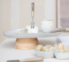 13-3/4"L x 10"W x 3-3/4"H Stoneware Footed Pedestal w/ Acacia Wood Base, Reactive Glaze, White & Natural (Each One Will Vary)