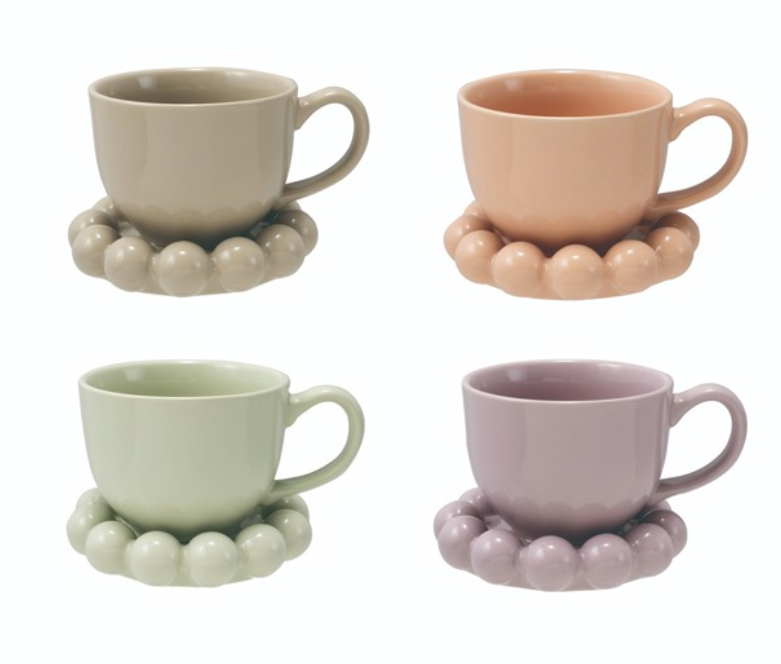 STONEWARE MUG AND SAUCER SET - 4 COLORS