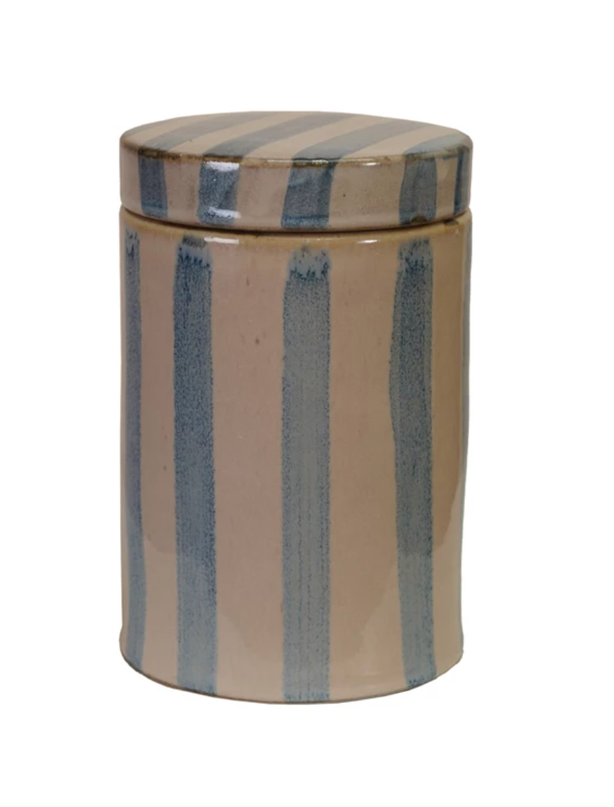 HAND-PAINTED STONEWARE STRIPED JAR WITH LID