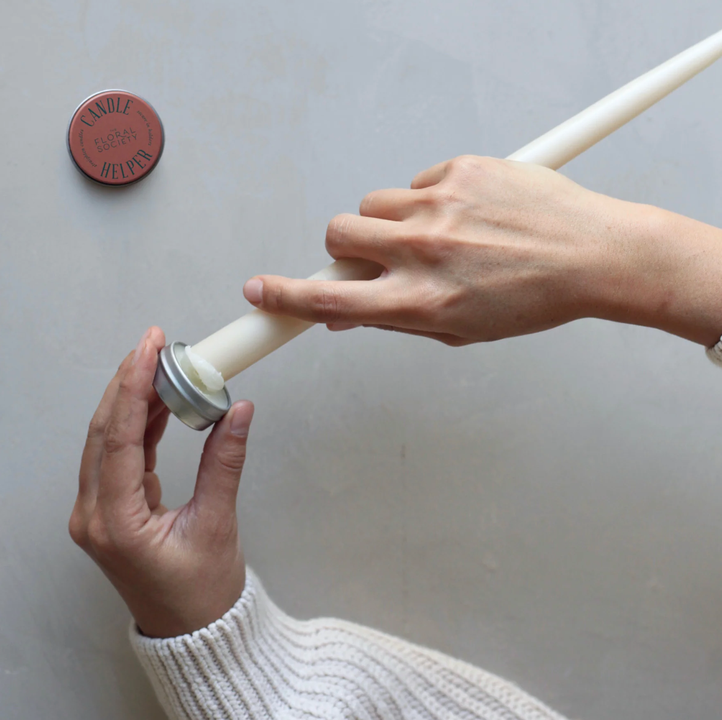 Use a pea-sized amount of wax on the candle base & press into holder. Forever pliable. Remove with hot, soapy water.