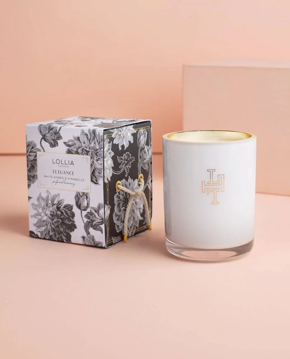 Illuminate your surroundings with Modern Romantic Luxury. A soft, captivating glow radiates from this all-natural soy and coconut wax blend candle, while the warmth of White Amber & Mirabelle essence adds a fresh yet soothing ambience to any boudoir.