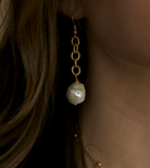 These earrings feature a beautiful baroque beehive style pearl on a a gorgeous matte gold chain. Whether your hair is up or down, these earrings make a statement