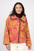 Scroll sherpa print jacket with ruffle detail in citrus and pink.
