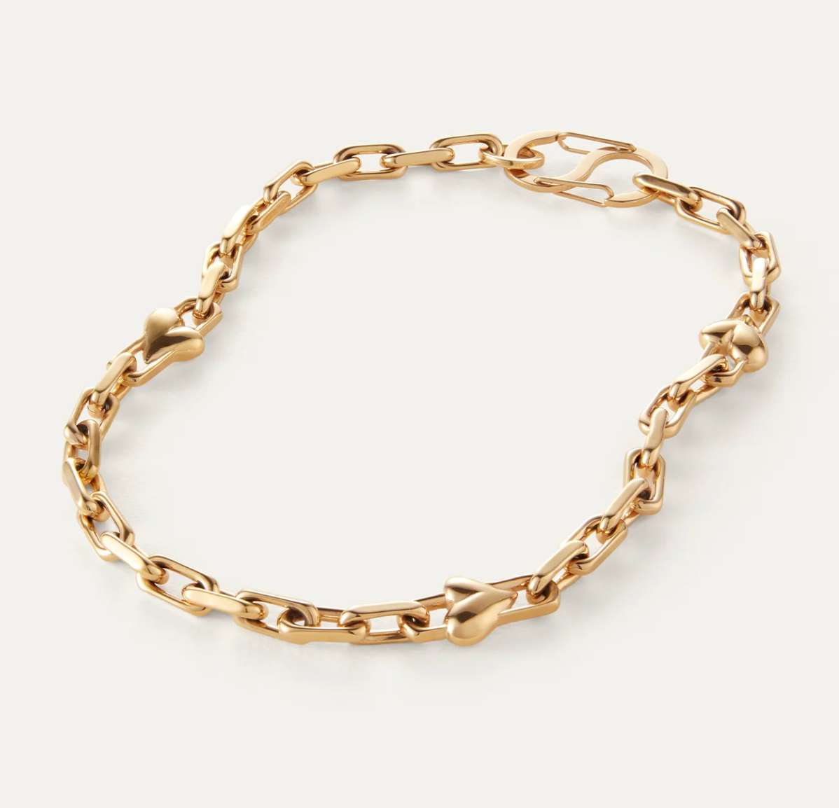 Crisp, faceted links are punctuated with small voluminous hearts. Wear the exaggerated S-clasp at the front for an alternate look. Finished in high-polish gold