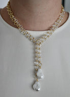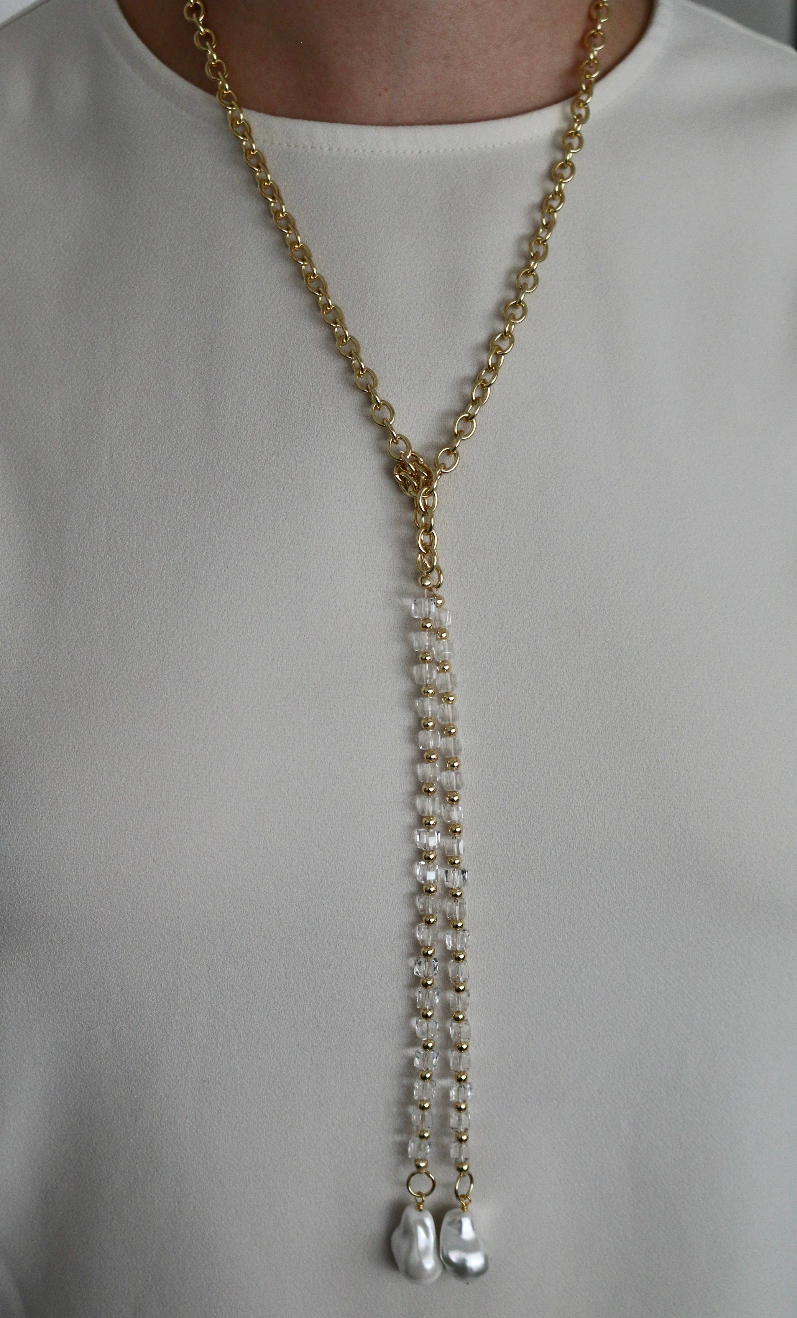 The Radiant Lariat Necklace from InspireDesigns’ Shine Bright Collection captures the essence of effortless glamour. Crafted with a chunky gold-plated chain, it transitions into strands of crystal-accented beading, finished with lustrous baroque pearl drops. The versatile lariat-style silhouette flatters every neckline and brings refined sparkle to both casual and dressy looks.