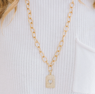 This gold chain mid-length necklace hits in the perfect spot! Choose the Heart DogTag or the stunning Crystal Cross, but buy the necklace and be ready to be asked where it is from! We Love her!