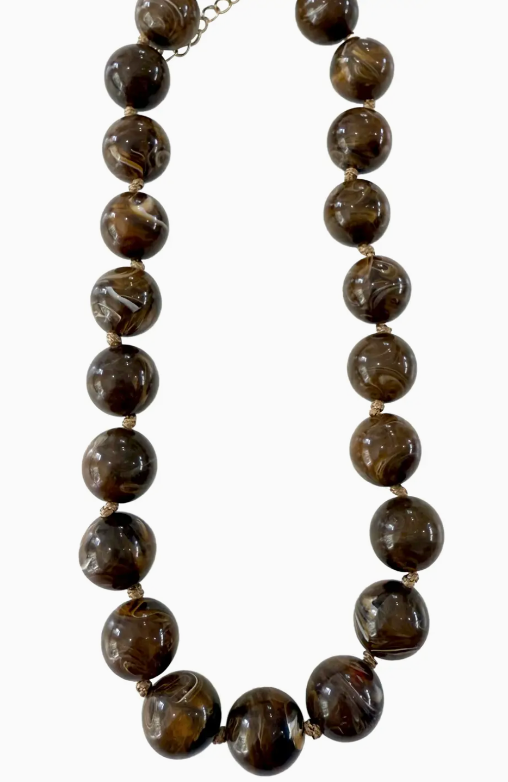Elevate your look with this bold and timeless Mabry Beaded Statement Necklace. Featuring large, glossy marbled beads with natural variations and swirls, this piece brings a striking yet sophisticated edge to any outfit. The adjustable gold-tone clasp allows for the perfect fit, whether you’re styling it with a chic evening dress or a casual daytime look.