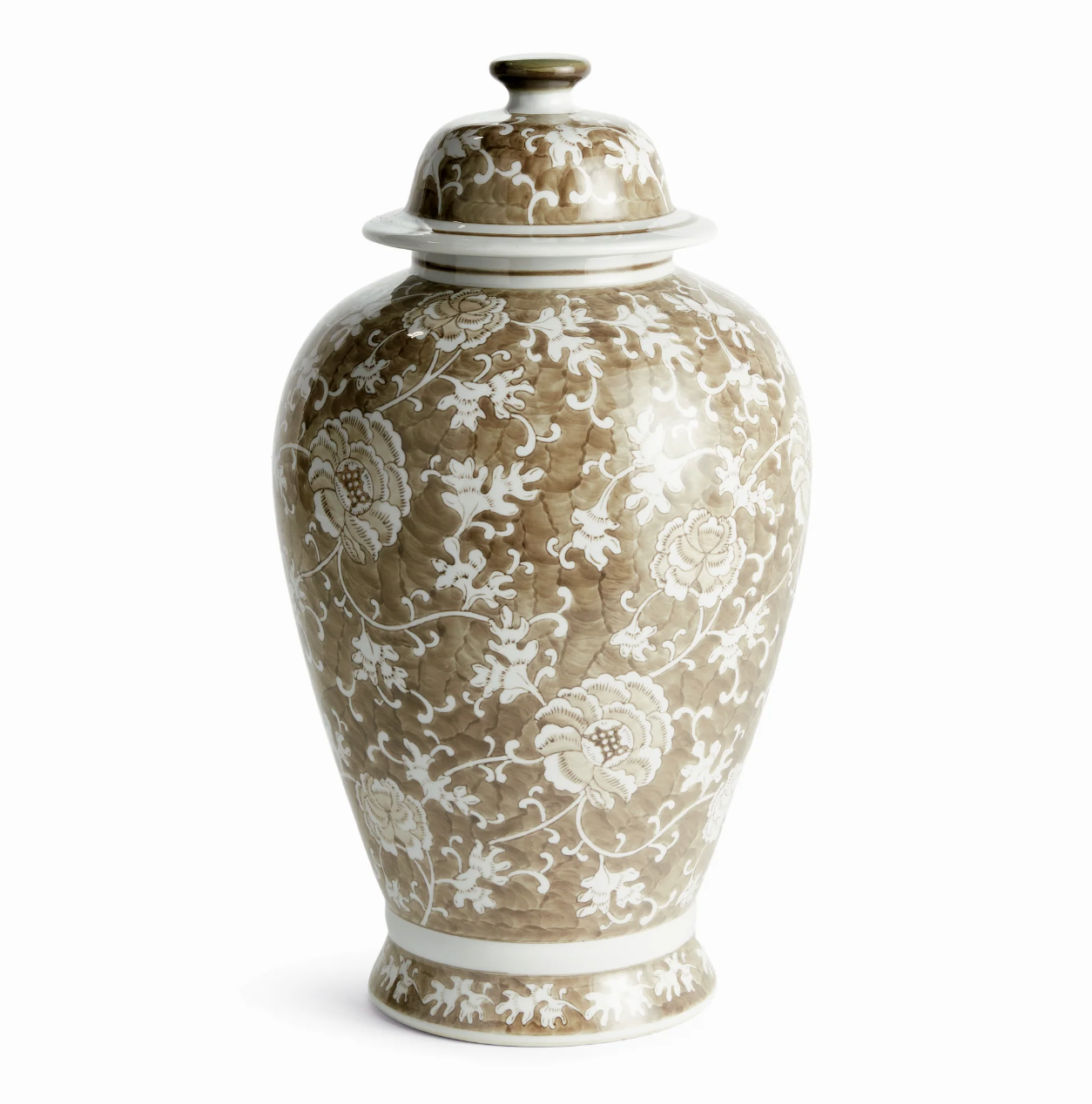 A classic chinoiserie look in taupe and white. In design, taupe is often associated with muted, sophisticated qualities. It evokes balance and timelessness. A tone that plays well in any palette, and is an inspired design choice for this lidded ginger jar. A welcome addition to the well-appointed bookshelf, mantel or entry console.