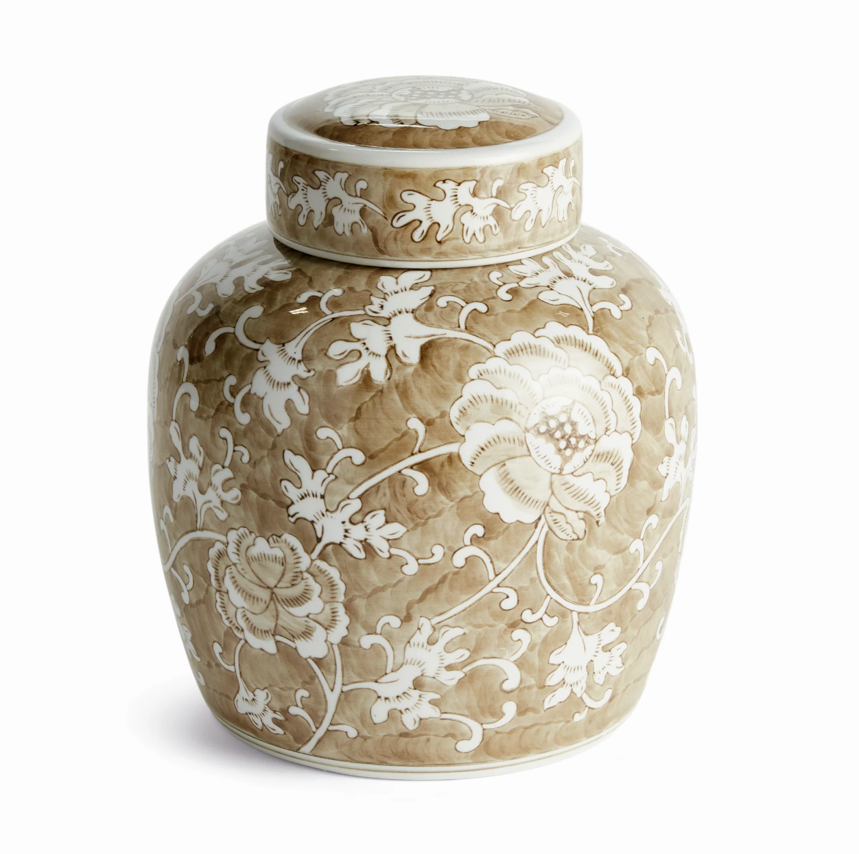 A classic chinoiserie look in taupe and white. In design, taupe is often associated with muted, sophisticated qualities. It evokes balance and timelessness. A tone that plays well in any palette, and is an inspired design choice for this lidded ginger jar. A welcome addition to the well-appointed bookshelf, mantel or entry console.