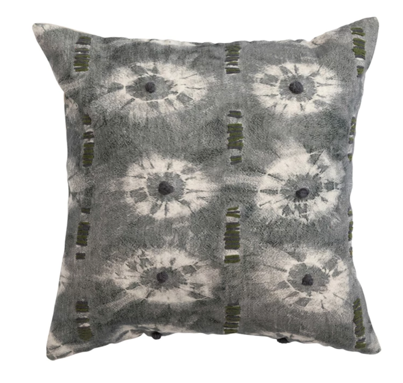 18" Square Linen Printed Pillow w/ Hand-Embroidery & Chambray Back, Grey & Cream Color