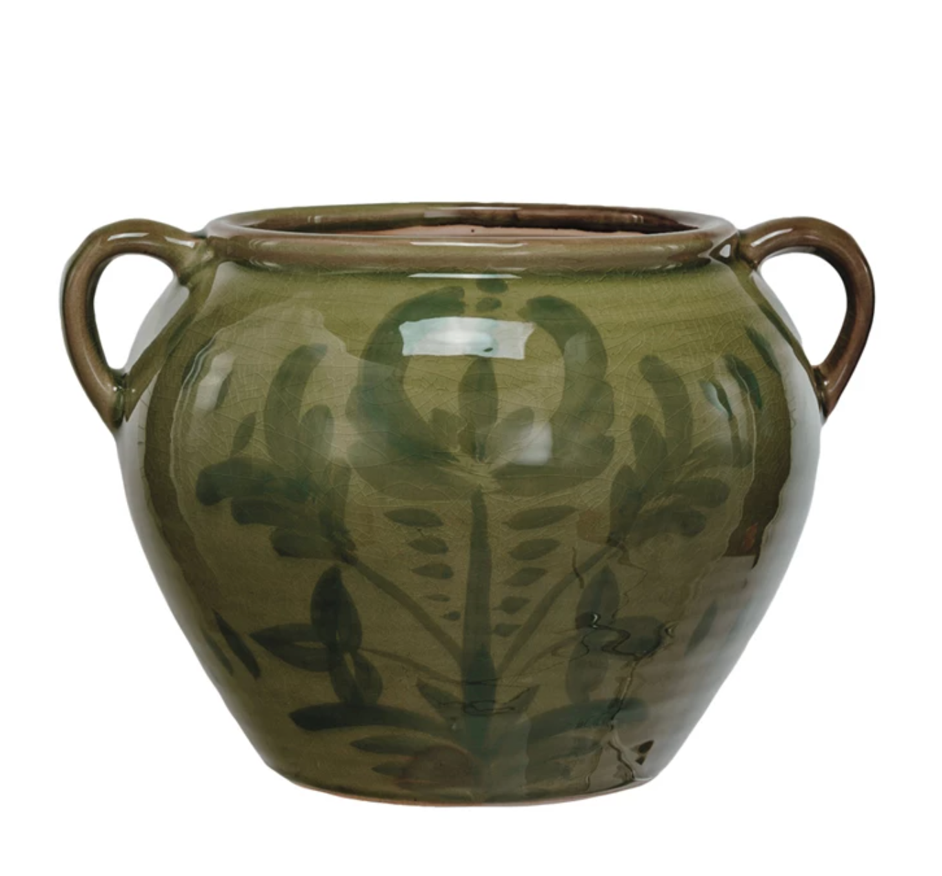10-3/4"L x 9-1/4"W x 7-3/4"H Hand-Painted Terra-cotta Urn w/ Handles, Reactive Glaze, Green (Each One Will Vary)