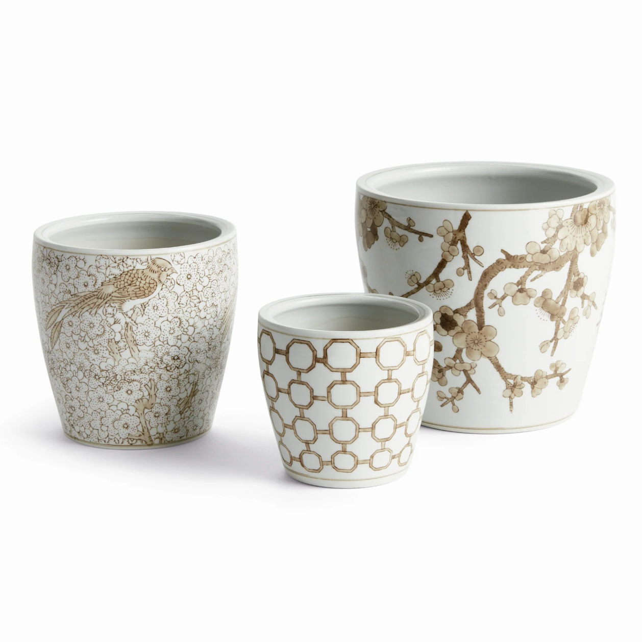 Classic chinoiserie-inspired coordinating patterns in taupe and white. In design, taupe is often associated with muted, sophisticated qualities. It evokes balance and timelessness. A tone that plays well in any palette, and is an inspired design choice for this set of 3 flower pots. A beautiful complement to your favorite greenery, herbs or florals.
