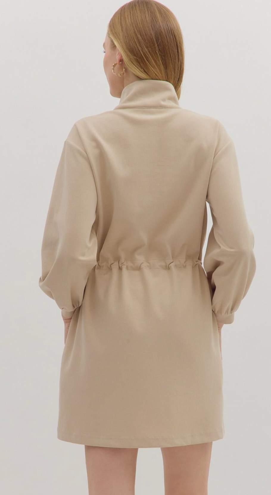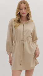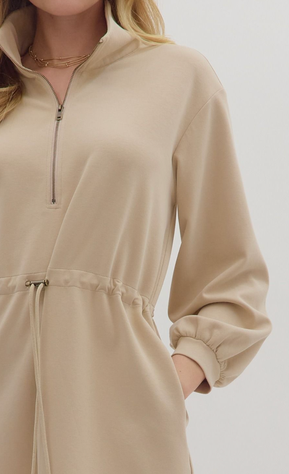 Solid long sleeve mini dress featuring half zip at front and adjustable drawstring waist. Side pockets. Unlined. Knit. Non-sheer. Medium weight.
