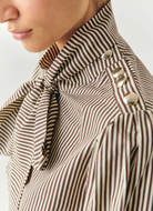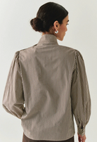 The Indigo Blouse features a high neckline, sculpted long sleeves, and a tie-front waist for added definition. Crafted from crisp cotton in brown and bone stripes.