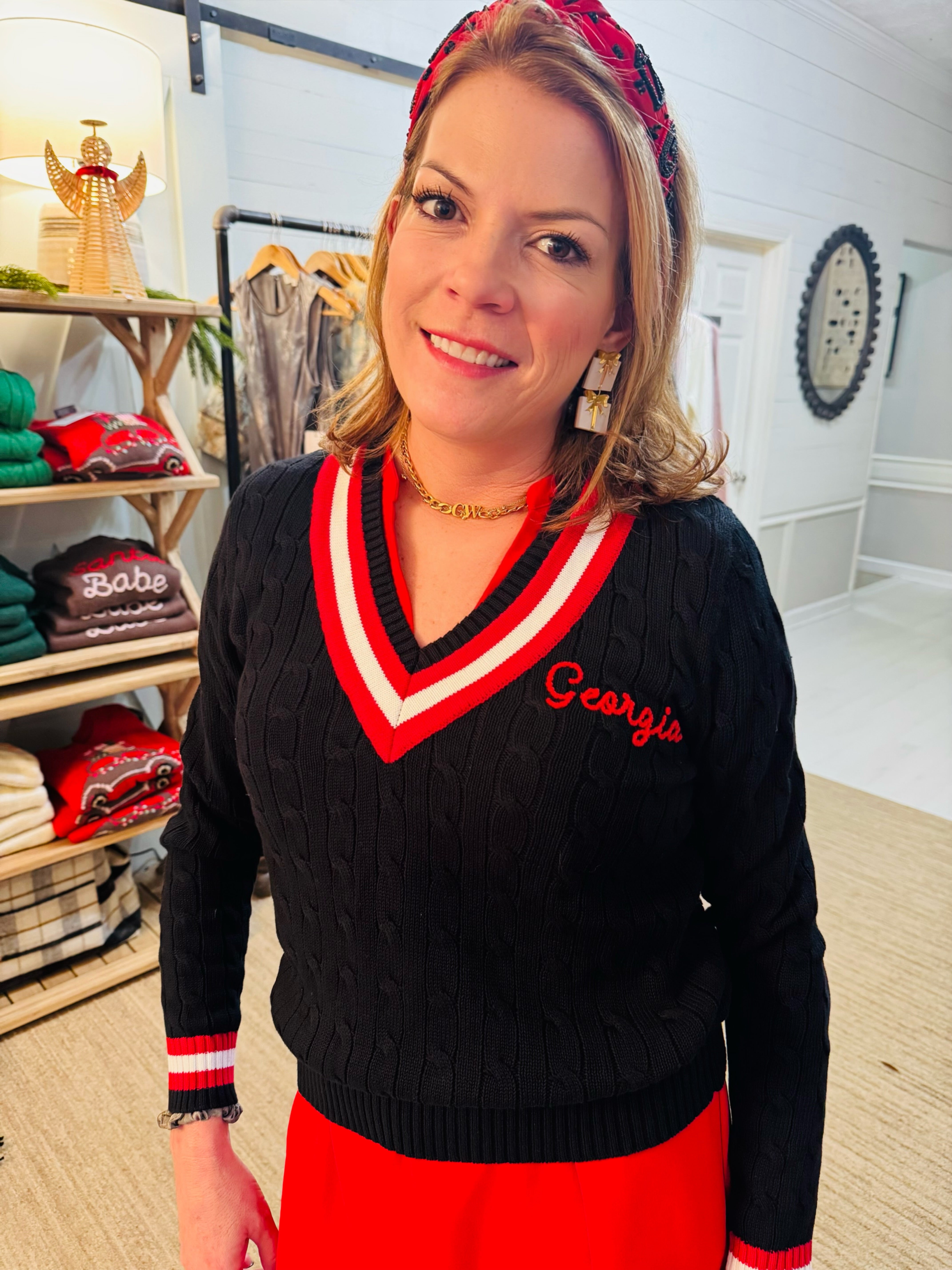 Cotton cable knit long sleeve vneck sweater in red with red Georgia embroidered on front. Red and white stripes on vneck and cuffs.