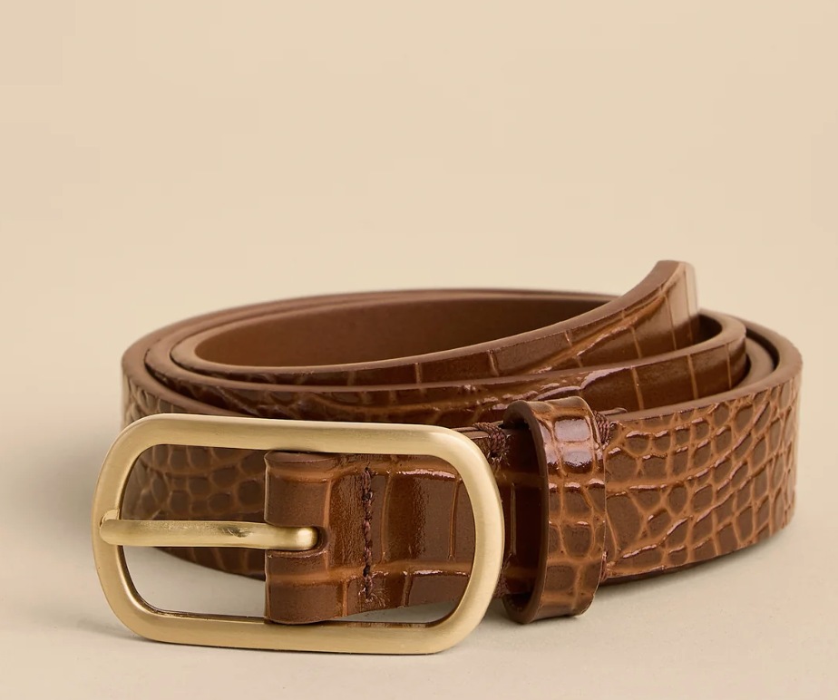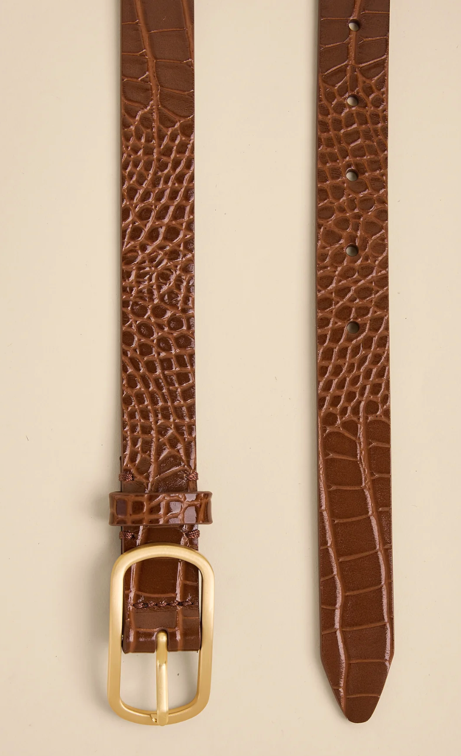 The accessory that makes you want to wear your shirt tucked every day: the luxe, embossed croc, brown leather, Thin Siren Belt. Made to pair with your favorite Spartina denim and dresses. You'll reach for this must-have belt season after season.