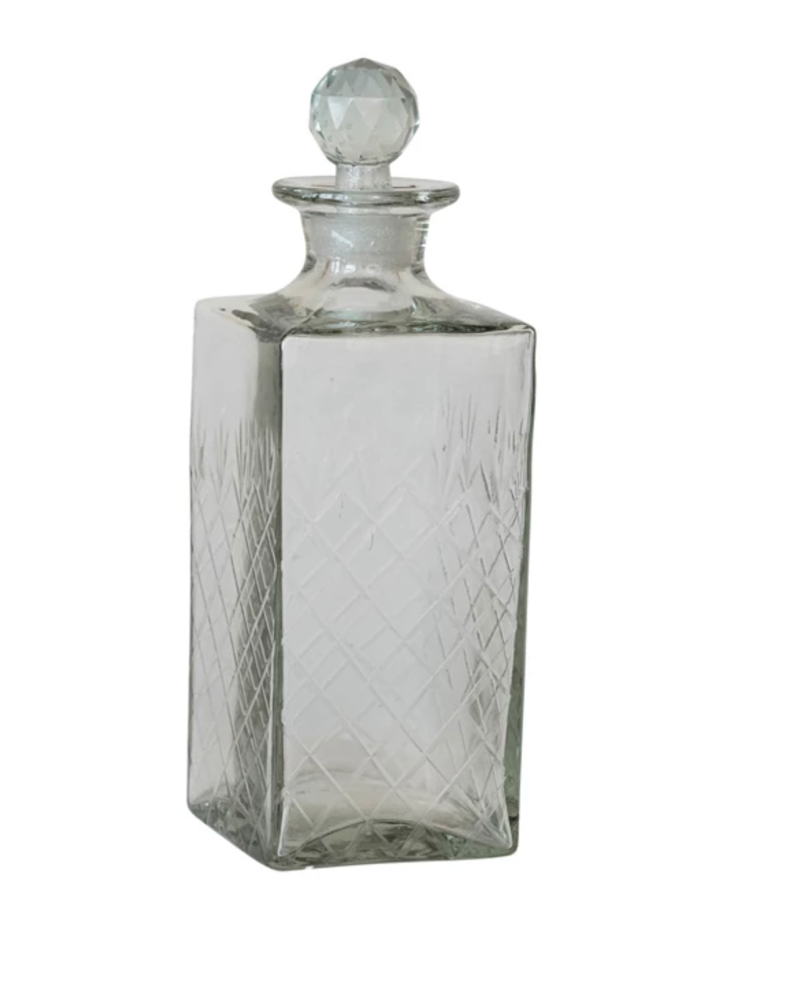 3-1/4" Square x 10"H 30 oz. Recycled Etched Glass Decanter w/ Glass Stopper
