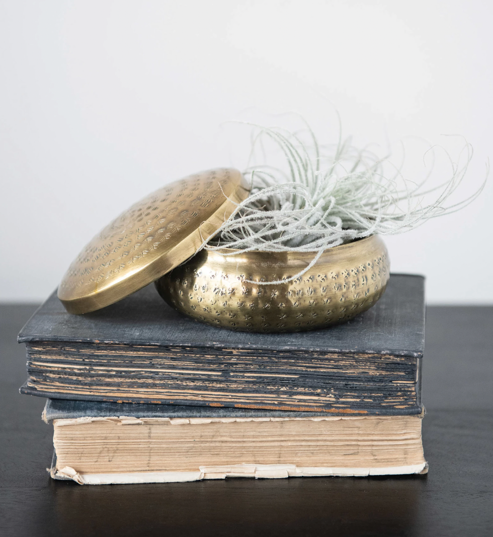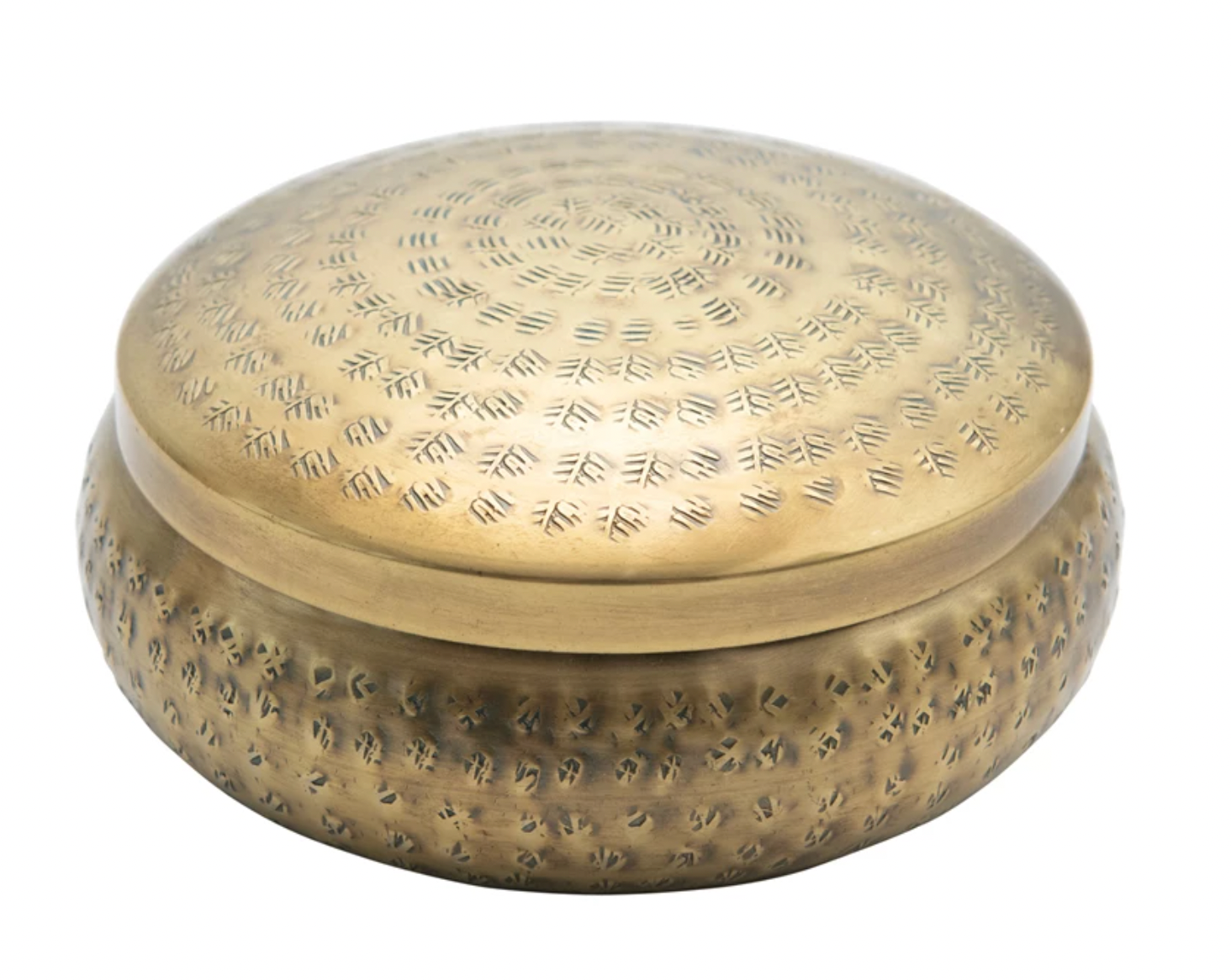 5" Round x 2"H Decorative Hammered Metal Container w/ Lid, Brass Finish