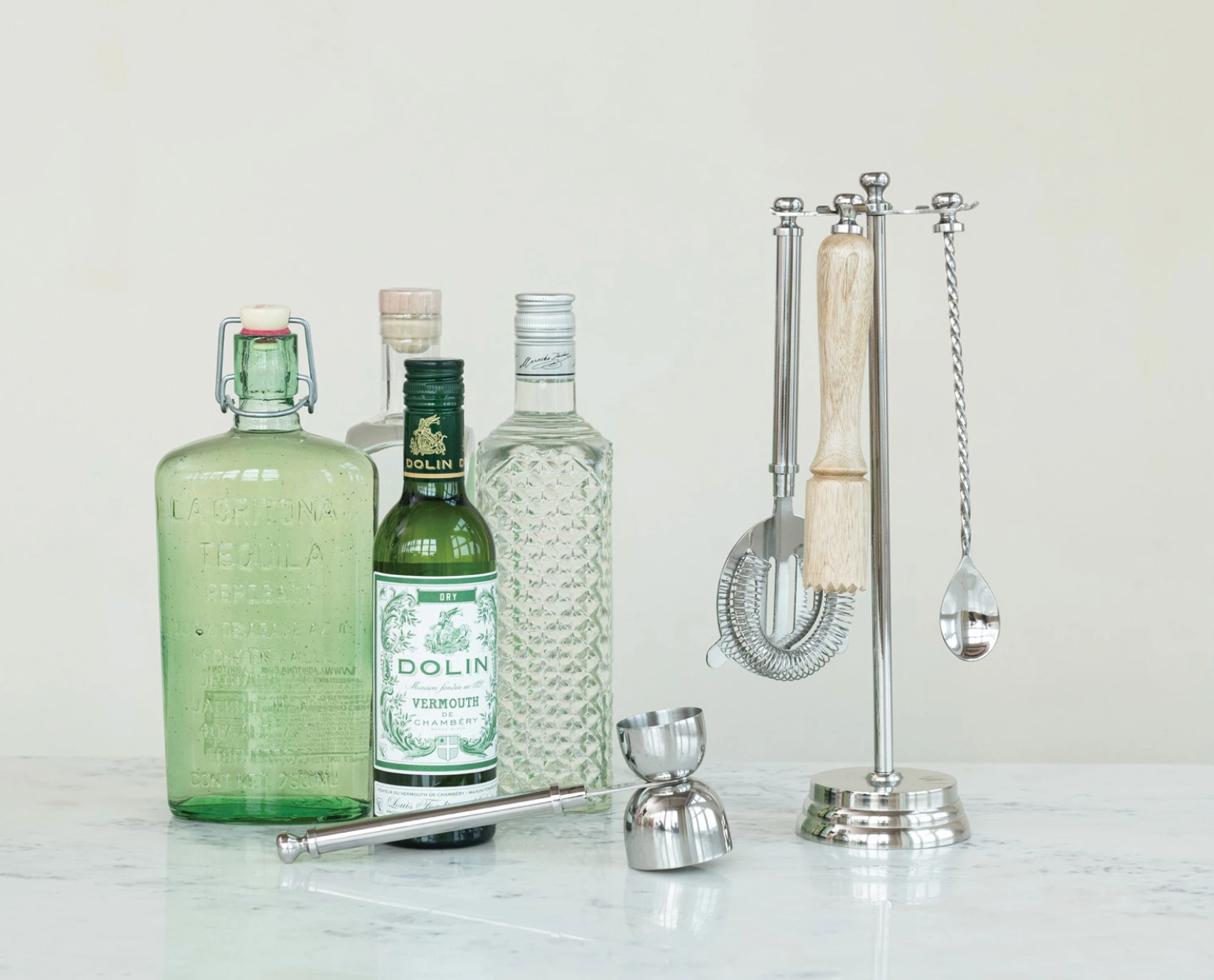 7-1/2"L - 9-1/2"L Stainless Steel & Mango Wood Bar Tools w/ 13"H Stand, Nickel Finish & Natural, Set of 5
