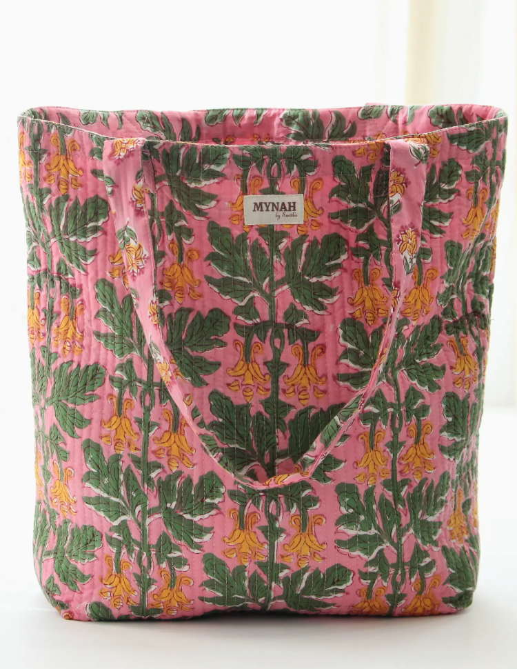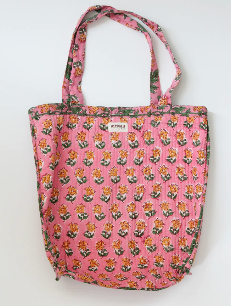 Gorgeous hand block printed quilted tote bag. The bag is reversible and has 2 different print on either side. You get value of 2 for the cost of one. A bag that makes an amazing gift! It is perfect size to fit a laptop. Quilting adds to the sturdiness. Quilted bag - perfect for on the go!