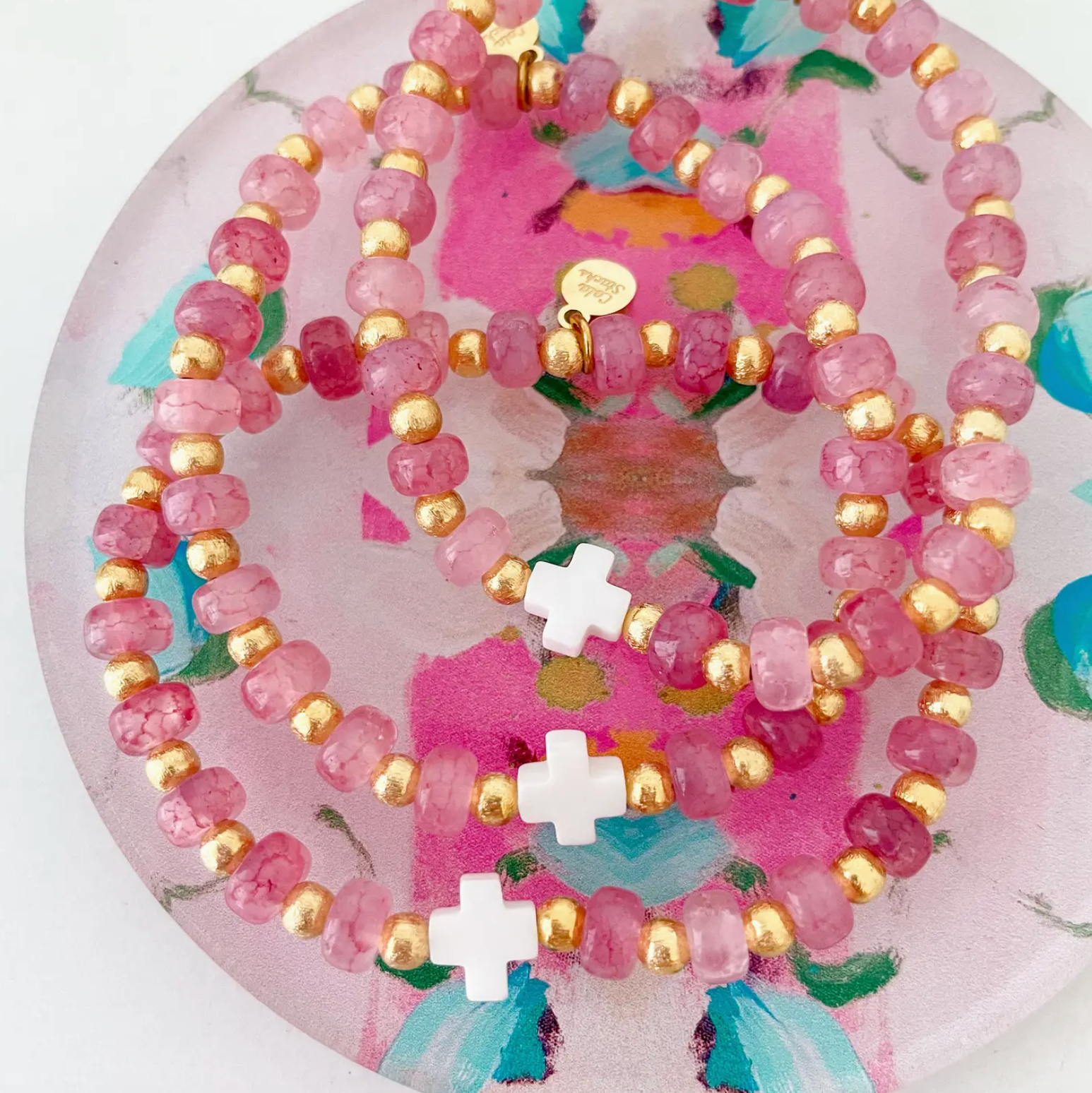 Explore the unique style of the Pink Cross Bracelet from Cola Stacks. This 7-inch accessory is crafted with small gemstone beads, adding a touch of elegance to any attire. Handmade in Columbia, SC by Payton Hollingsworth, each piece is a personality staple and a daily reminder of those you love. With Cola Stacks, you're not just wearing a bracelet; you're expressing your mantra and making a faith-based statement. Live out your style with Cola Stacks.