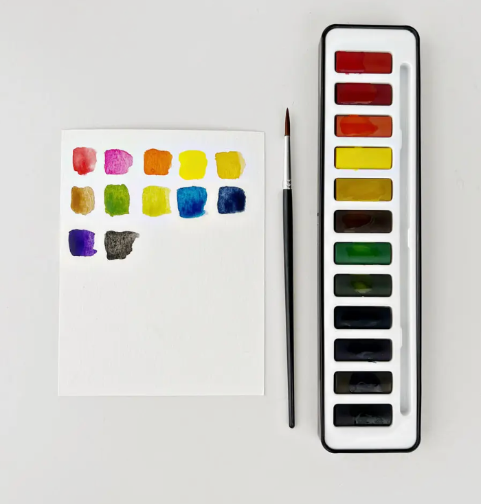 Delight in the art of watercolor with this watercolor paint set. Paints are high-quality which ensures smooth consistency and vibrant colors. 12 basic colors will give you endless possibilities for mixing you own custom hues. Use the tin lid as a mixing palette. Round size 4 brush included.