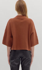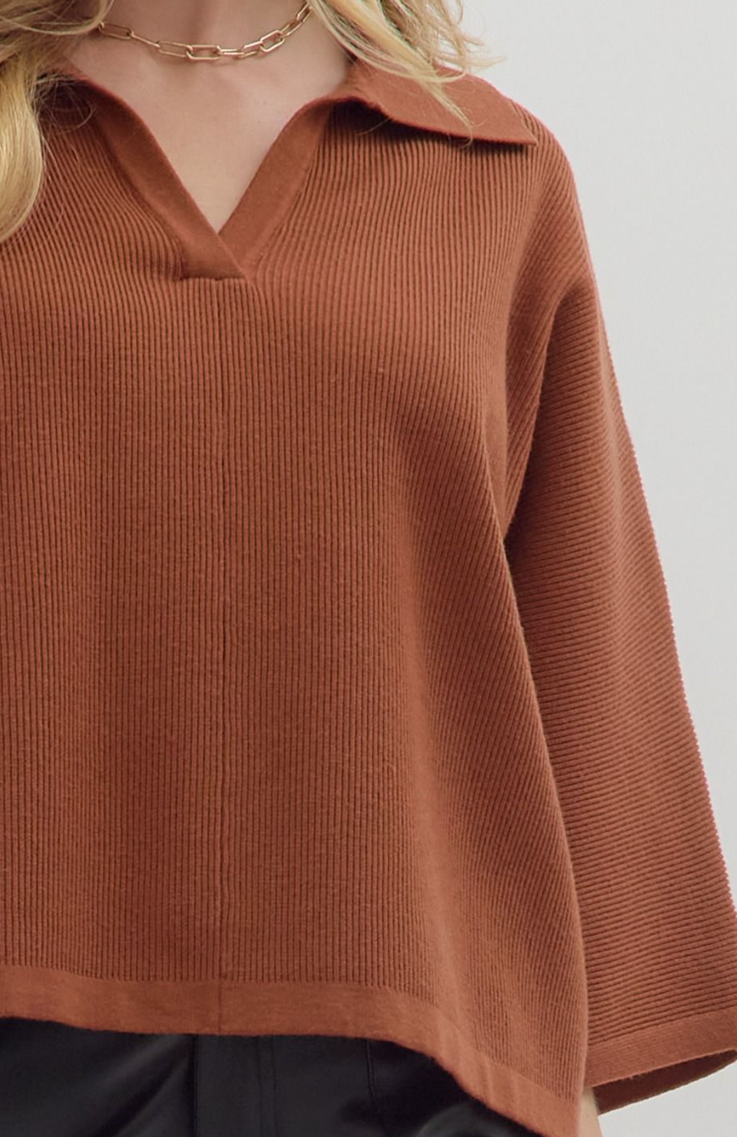 3/4 SLEEVE COLLARED VNECK KNIT TOP - BROWN