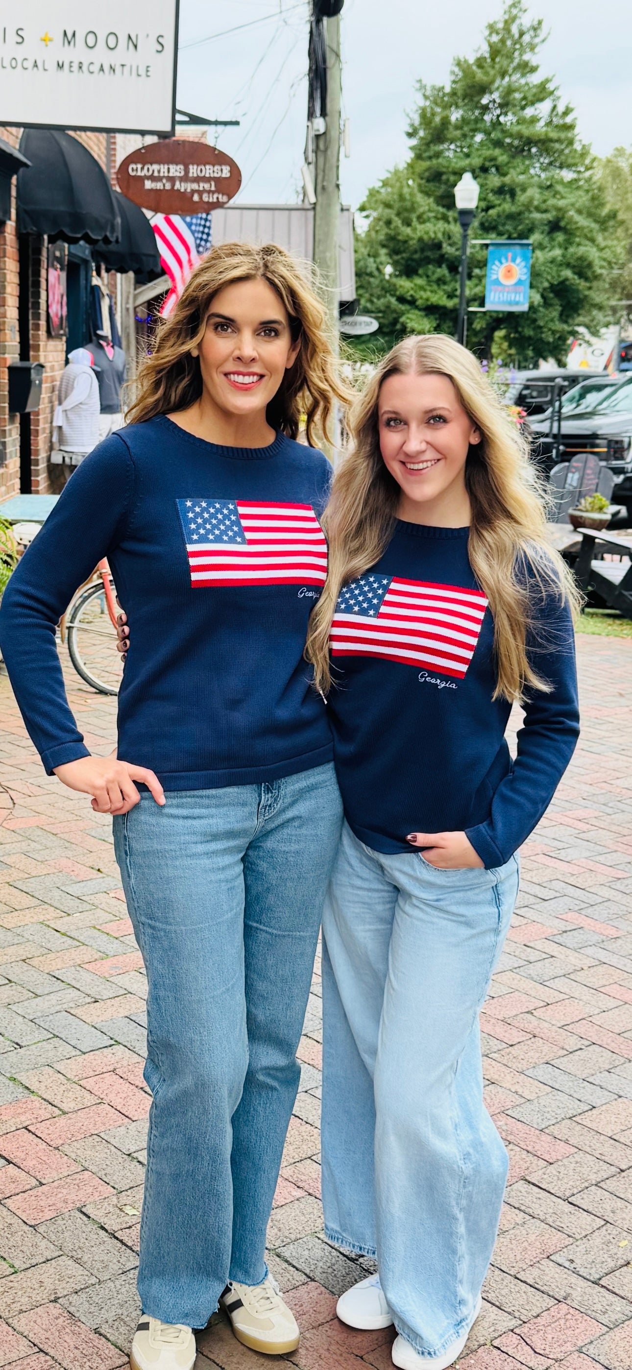 Cotton long sleeve sweater in navy with American flag on front and Georgia embroidered under flag in white.