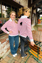 Cotton cable knit long sleeve vneck sweater in red with red Georgia embroidered on front. Red and white stripes on vneck and cuffs.