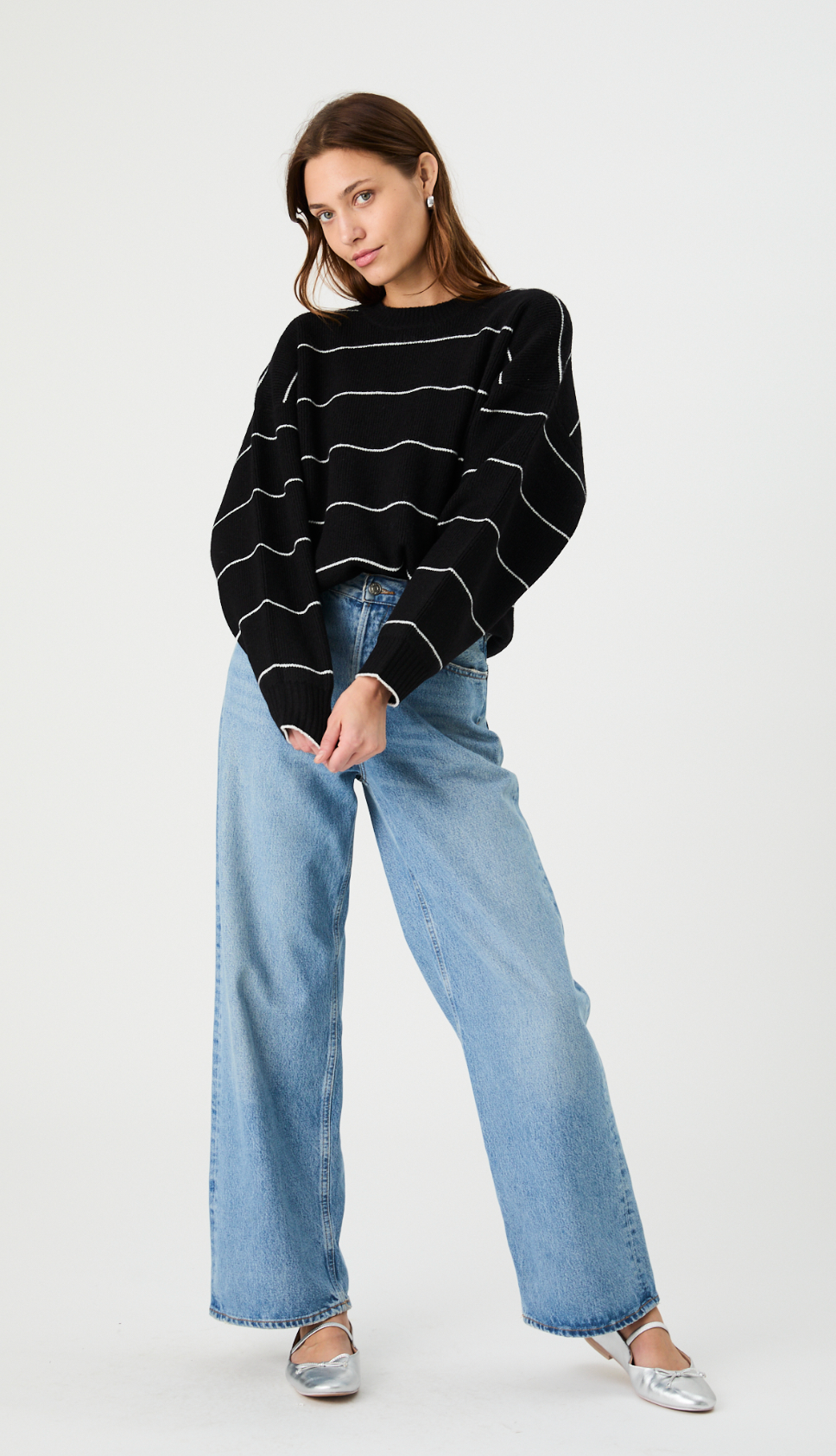 RIDDLEY KNIT TICK STRIPE CREW - BLACK PORCELAIN