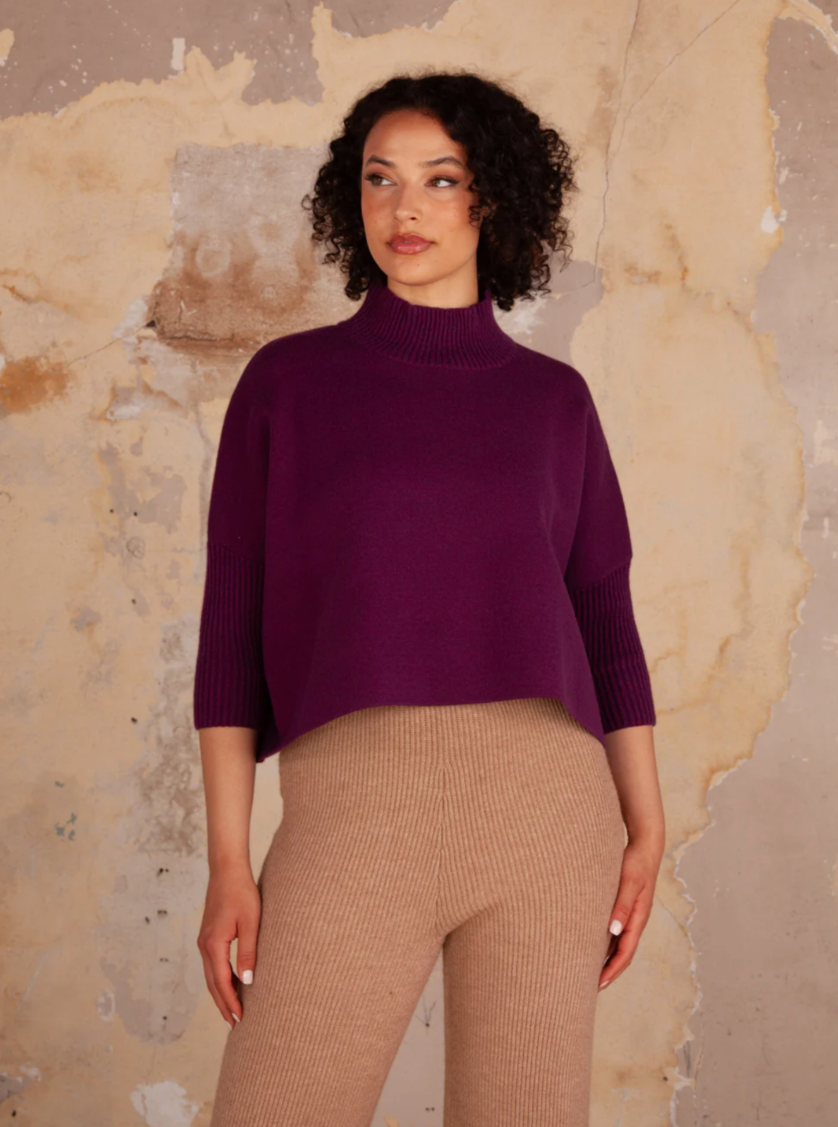 Oversized boxy sweater with fitted mock neck & 3/4 sleeves