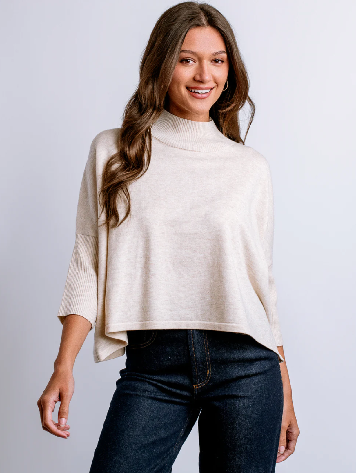 Boxy mock neck 3/4 sleeve top in solid color with rib hem accents.